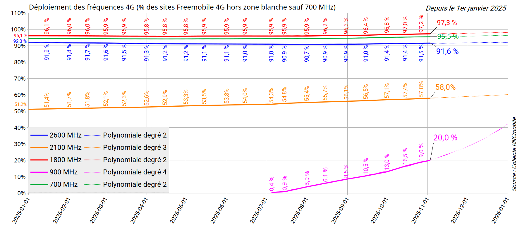 Il semble que depuis fin 2024, les antennes situées en zone très peu dense (zones à habitat dispersé et très dispersé de l'INSEE), ne disposent plus de cette fréquence, notamment lorsque Freemobile est contraint par l'ARCEP d'équiper ces sites dans le seul objectif de respecter le quota de 25% de la décision d'attribution du 3500 MHz.