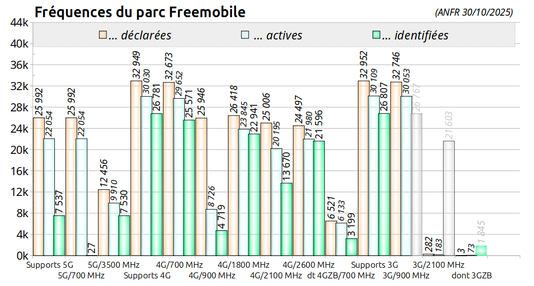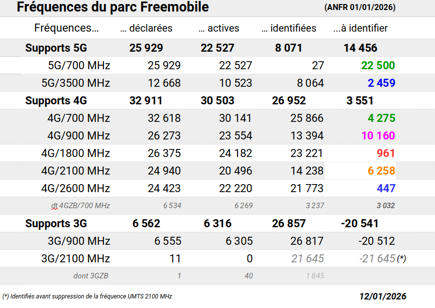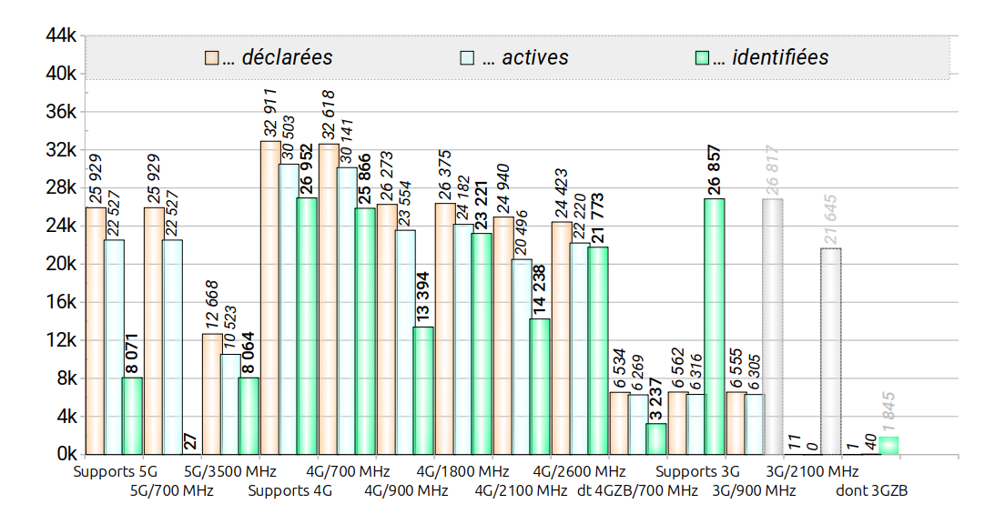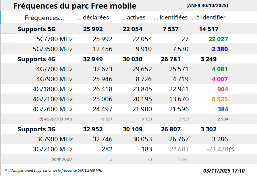 (*) Une partie des fréquences 2100 MHz n'est pas détectable (activation massive de plus de 7000 sites en mai 2024).