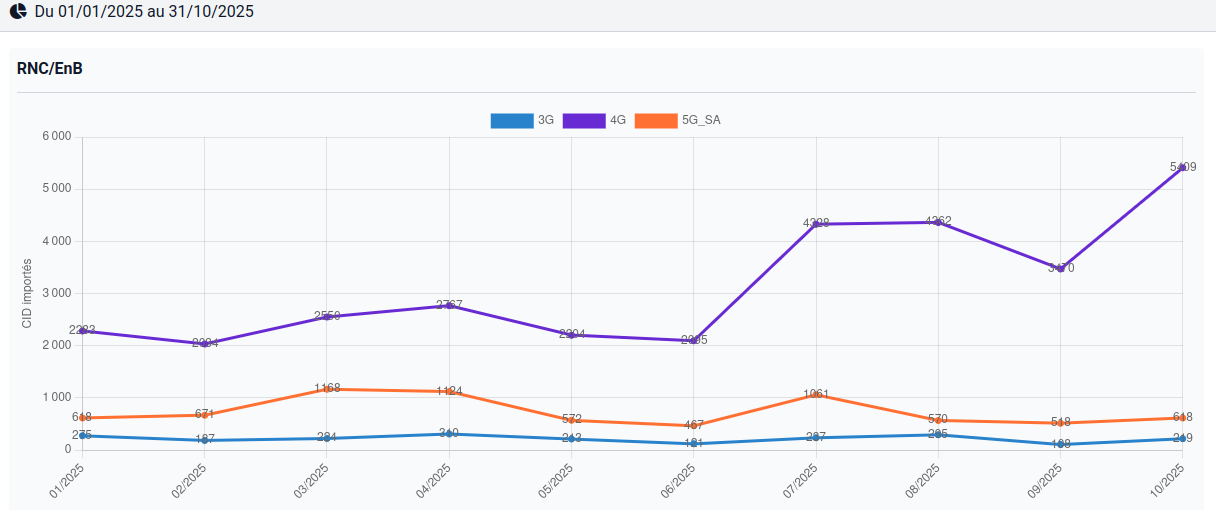 Au 3 novembre 2025 à 17 h, 7537 sites émettant en 5G SA sur 9910 équipés en 3500 MHz ont été identifiés par un contributeur RNCmobile, soit : 76,1% d'entre eux.